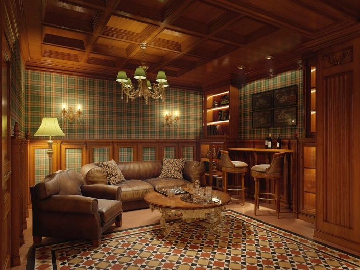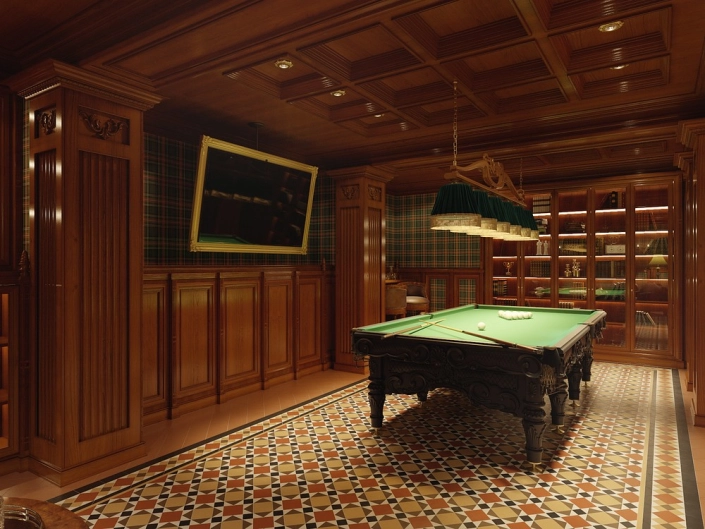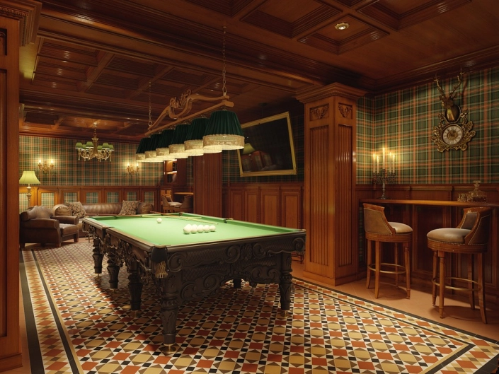 Оформление комнаты полностью зависит от дизайна стола. Обычно бильярдные столы делают из дерева и сукна, поэтому данные материалы нужно использовать в интерьере бильярдной комнаты. Если площадь позволяет создать зону отдыха, оборудуйте ее мягкой мебелью. Только учтите, что она должна быть достаточно высокой для наблюдения за игрой. Уместна в комнате и барная стойка. Креативное оформление бильярдной подразумевает размещение в комнате настенного телевизора, игровых автоматов и акустической системы. Само собой, все это удастся разместить только в просторной комнате.