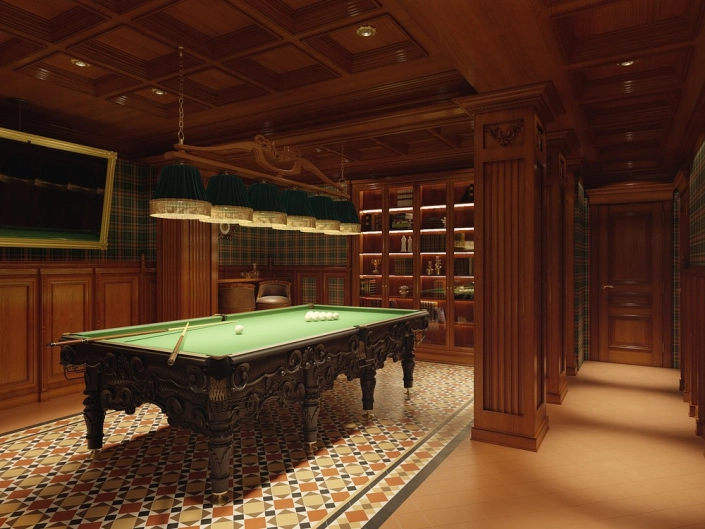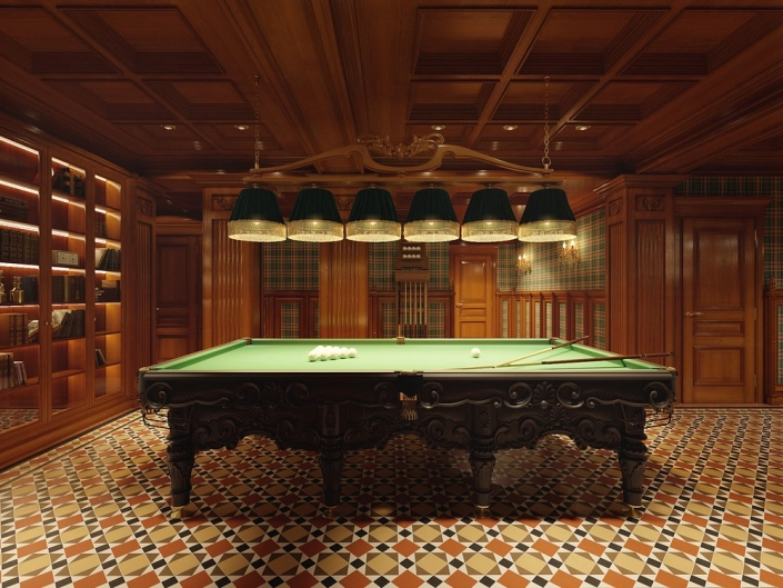 Бильярдный стол довольно массивный, поэтому на напольное покрытие оказывается повышенная нагрузка. Идеальное напольное покрытие в бильярдной - это керамогранитное, деревянное или ковровое. Категорически запрещается использовать керамику, поскольку пол будет скользким и может повредиться при падении шара.