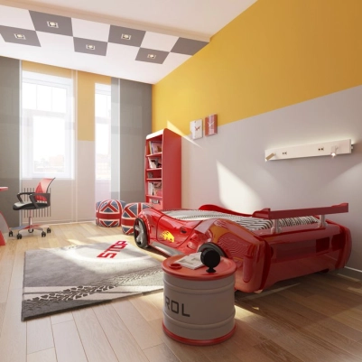 Яркий динамичный интерьер - для поклонника автогонок и известного мультфильма " Тачки". Цветовое решение стен напоминает о пустынном ландшафте. Сочный красный цвет основных предметов обстановки уравновешивается черно-серыми оттенками.