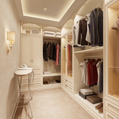 Гардеробная комната наполнена светом и воздухом, благодаря цветовому решению мебели, стен и потолка. Шкафы, выполненные в классическом стиле, вместительны и легки. Ярким акцентом в интерьере является зеркальная поверхность на стене.