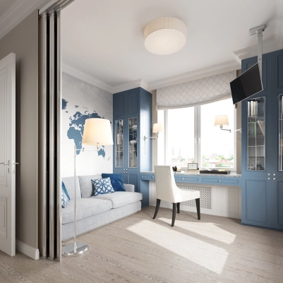 Интерьерные особенности кабинета, позволяют проводить в нем еще больше времени. Устав от работы, можно отдохнуть на мягком диване и почитать книгу сидя на оборудованном подоконнике. Приглушенные тона не отвлекают и не раздражают взгляд и мысли.