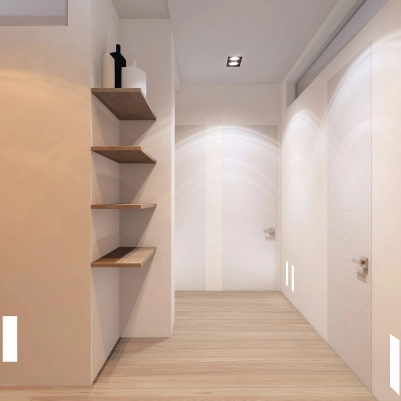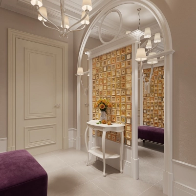 Холл, выполненный в теплой цветовой гамме, визуально расширяется за счет глянцевого блеска напольной плитки и, отражающих свет, дверей шкафа-купе. Скрытая подсветка и бра, излучающие теплый свет, делают холл уютнее.