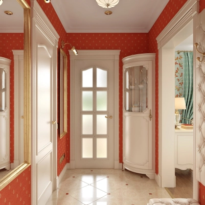 Цветовая гамма и стилистика холла весьма сдержанная и равномерная, больше склоняется в сторону минимализма. Серые оттенки стен и многочисленные двери создают ощущение порядка, и строгости при этом отлично гармонируют между собой.