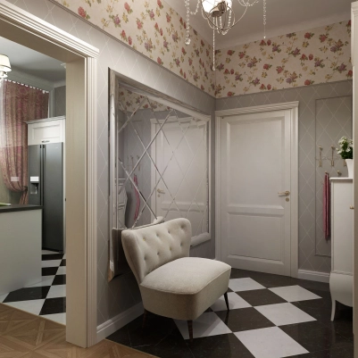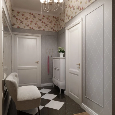 Коридор выглядит достаточно сдержанно. Белые двери на фоне серых стен с тонким геометрическим рисунком смотрятся очень красиво. Дополняет обстановку белый же изящный комод, не перегруженный декором. На потолочном светильнике-люстре в три свечи висят хрустальные бусы, которые в эклектике данной обстановки сочетаются с другими деталями очень гармонично.