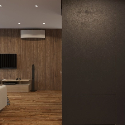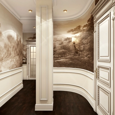 В дизайне коридора присутствует колонна, которую нельзя было убрать из-за особенностей перепланировки квартиры. Однако этот факт в связи с активным декором стен холла, практически не заметен.