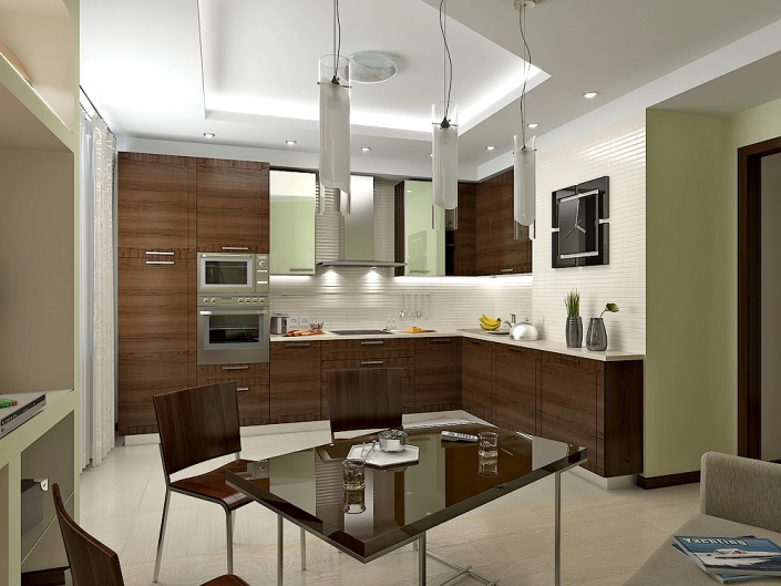 - Мебель и бытовая техника. Перед вами стоит сложная задача: разместить в относительно небольшом, а иногда даже маленьком помещении мебель и всю бытовую технику, необходимую для быстрого и удобного приготовления пищи (кухонный комбайн, микроволновка, мультиварка и др.). Если кухня малогабаритная, о громоздких тумбочках придется забыть. Максимум, что можно себе позволить - пара-тройка миниатюрных шкафчиков и функциональный “пенал”, состоящий из выдвижных ящиков, в которых удобно размещать посуду и различные кухонные принадлежности. Мелкую бытовую технику можно хранить в тумбочке. Весьма кстати будут настенные полки, которые вместят в себя большую часть бытовой техники. Дизайн кухни больших размеров допускает размещение всевозможных шкафчиков и тумб, если их присутствие оправдано потребностями домочадцев.