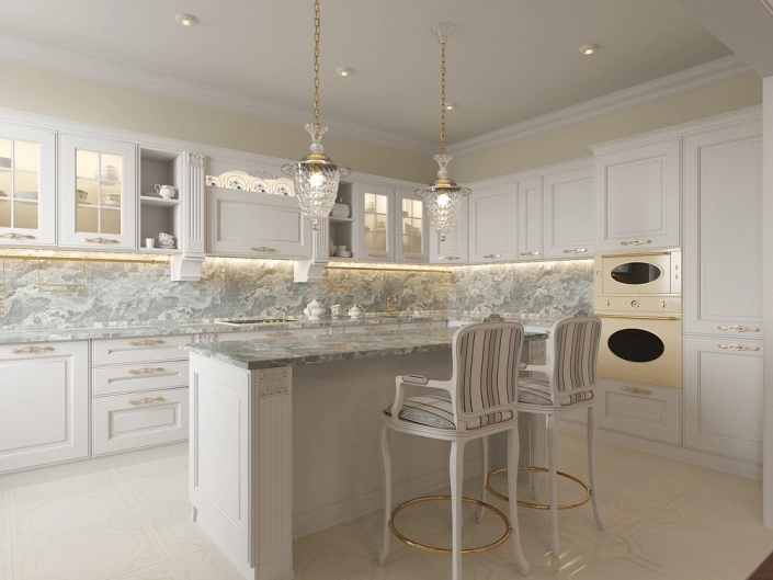 - Оформление рабочей зоны . Пространство стены, находящееся между столешницей и навесным шкафчиком, наиболее подвержено загрязнениям. Если его не “защитить”, даже самый шикарный интерьер в скором времени будет испорчен брызгами масла. Прекрасными материалами для оформления рабочей зоны являются кафельная плитка и закаленное стекло. Они неприхотливы в уходе и смотрятся очень достойно. Особой популярностью пользуется закаленное стекло, из которого делают так называемые фартуки с шикарными 3D рисунками. Такой фартук станет не только защитным, но и декоративным элементом интерьера кухни.