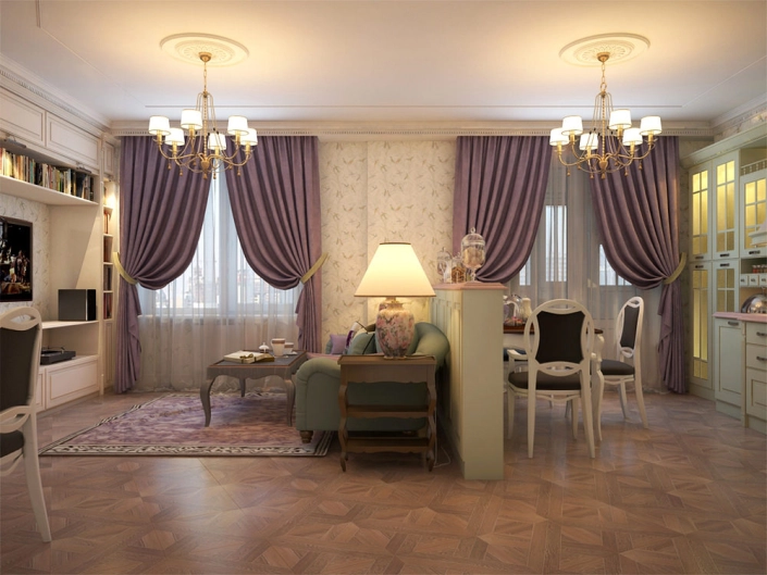 - Текстиль и аксессуары. Остается завершить образ кухни шторами и мелкими аксессуарами в виде комнатных растений, семейных фотоколлажей и т.д. Не стоит выбирать слишком плотные занавески. Дизайн интерьера кухни подразумевает использование тонких светлых штор с ярким, но не наляпистым рисунком. Очень красиво и оригинально смотрится интерьер, в котором скатерть соответствует цвету и отделке штор.
