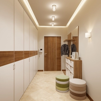 Интерьер прихожей выполнен в коричневых и молочных тонах, такое цветовое решение придает прихожей благородный и законченный вид. Мебель достаточно практична и функциональна, не перегружена лишними деталями. Особое внимание уделено освещению, используется рассеянный и точечный свет.