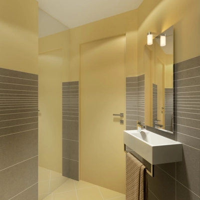 Современные инновации и классическое наполнение делают интерьер данного санузла стильным, мягким, наполненным. Особый шарм помещению придают деревянные полки и умывальник "под старину" с поручнем для полотенце, навевающий мысли о комфорте и благе.