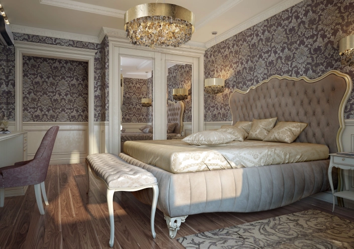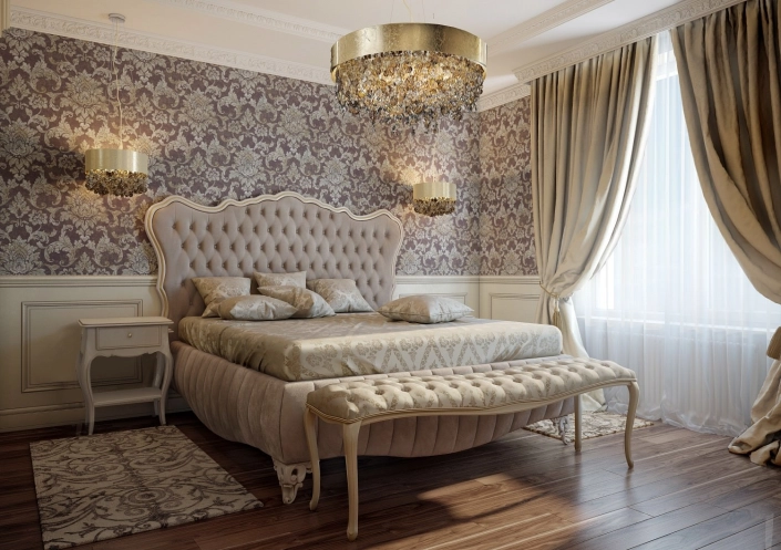 Характерные черты этого стиля - великолепная архитектура и идеальная гармония цвета. Интерьер спальной комнаты оформляется в светлых тонах, в качестве контрастных акцентов часто используют торшеры с темным абажуром. Не исключено размещение колонн и статуй. Данный стиль выбирают настоящие аристократы, которые хотят быть окружены роскошью даже во сне.