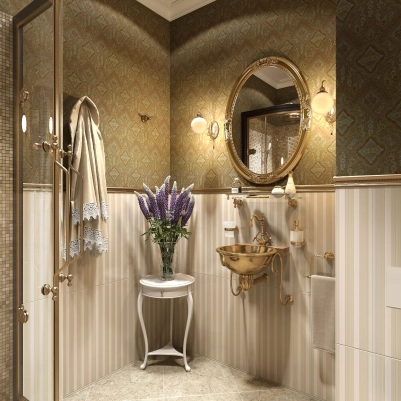 Нетривиально в ванной выполнена и подсветка- это ниши с туалетными принадлежностями возле самой ванной, освещение зеркала возле вместительной раковины и встроенные в потолок простые точечные светильники. Таким образом создан эффект уюта и комфорта одновременно.